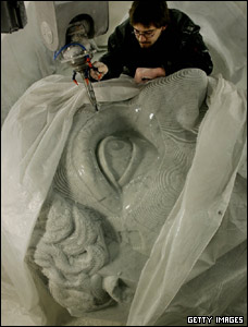 مجسمه سازی در حال تراشيدن سر کنستانتين، امپراتور روم باستان، در شهر اشنوبرگ در منطقه لوکزامبورگ شمال آلمان. امسال اين منطقه پايتخت فرهنگی اروپا خواهد بود.