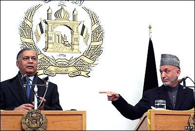 حامد کرزی رييس جمهور افغانستان و شوکت عزيز نخست وزير پاکستان در يک نشست خبری در کابل. مقامات اين دو کشور پس از ديدار و گفتگو در کابل، به نتيجه مشخصی در مورد طرح جنجال برانگيز مين گذاری در مرز دو کشور نرسيده اند.