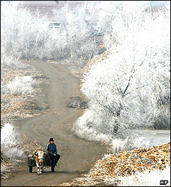کشاورز چينی در حال عبور از يک خيابانی که شبنم يخزده شاخه های درختان آن را پوشانيده است.