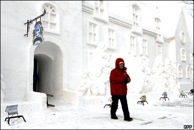زن چينی در مقابل خانه ای برفی در شهر هاربين در شمال چين. در گوشه و کنار اين شهر که ميزبان بيست و سومين جشنواره بين المللی يخ و برف است، مجسمه هايی از يخ و برف ديده می شود.