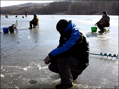 ماهيگيران بلغار در حال تلاش برای صيد ماهی در يک درياچه يخزده در بلغارستان.