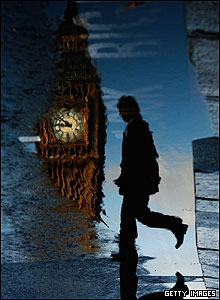 تصوير يک مرد رهگذر بر آب در نزديکی ساعت لندن معروف به بيگ بن در لندن. تند باد و بارش شديد باران در بريتانيا سبب افتادن درختان روی ريل قطار و جاری شدن سيل در برخی مناطق شده است.