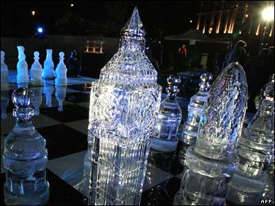 مهره های بزرگ شطرنج تراشيده شده از يخ در ميدان ترافالگار در مرکز لندن. يک مسابقه شطرنج بين تيم های شطرنج از لندن و مسکو برگزار شده است.