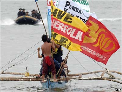 پرسنل نيروی دريايی فيليپين سوار بر قايق تندرو به سمت قايق حامل تظاهر کنندگان مخالف با برگزاری اجلاس کشورهای جنوب شرقی آسيا می روند. اين اجلاس قرار است روز سيزدهم ژانويه با سخنرانی رييس جمهور آرويو آغاز شود.