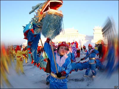 رقص هنرمندان چينی در مراسم افتتاحيه جشنواره بين المللی يخ و برف در شينيانگ. |