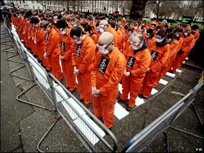 تظاهر کنندگان از گروه عفو بين الملل در مقابل سفارت آمريکا در لندن به مناسبت پنجمين سالگرد باز شدن بازداشتگاه گوانتانامو در کوبا.