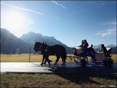 توريست ها سوار بر گاری در جنوب آلمان. دمای معتدل در اين موقع از سال باعث شده که اسکی و ساير ورزش های زمستانی در اين منطقه تقريبا غيرممکن شود.