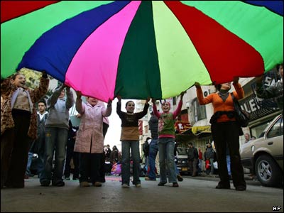 کودکان فلسطینی در مراسمی با هدف به آشتی دعوت کردن دو گروه حماس و فتح که توسط انجمن کودکان فلسطینی برگزار شده است