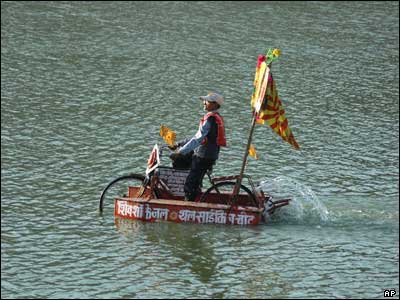 یک مخترع هندی درحال سواری بر روی دریاچه ای در احمد آباد هند بوسیله قایقی دوچرخه ای که خود اختراع کرده است