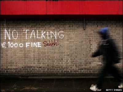 قرار است در بعضی از مناطق بریتانیا طرحی برای جلوگیری از تجمع نوجوانان به اجرا گذاشته شود. مردی در حال رد شدن از مقابل شعاری بر روی دیوار با مضمون "حرف زدن ممنوع"، "جریمه ای هزار پوندی" |