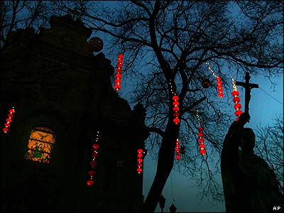 چراغهای سنتی چینی آویخته شده بر ورودی صومعه ای در پکن، چین. دولت چین از تصمیم واتیکان برای بهبود رابطه خود با کلیساهای کاتولیک این کشور استقبال کرد. در گذشته دولت کمونیستی چین از نظارت واتیکان بر کلیساهای کشور جلوگیری می کرد.