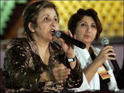 شیرین عبادی، وکیل ایرانی و برنده جایزه نوبل صلح، در اجلاس جهانی اجتماعی (World Social Forum) در نایروبی کنیا. این اجلاس چند سالیست که پيش از اجلاس جهانی اقتصاد "داووس" برگزار می شود.