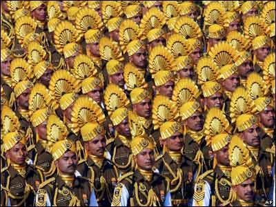 سربازان هندی در حال تمرین برای شرکت در مراسم پنجاه و هشتمین سال استقلال این کشور که قرار است 26 ژانویه در دهلی نو برگزار شود.