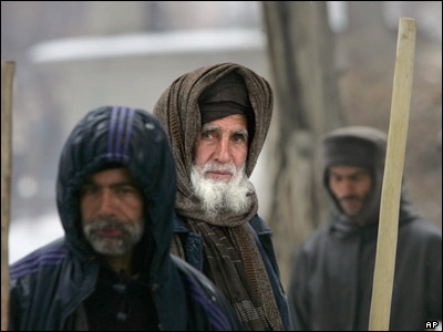 کارگران شهرداری کابل در حال پارو کردن برف پياده رو يکی از خيابانهای اين شهر.