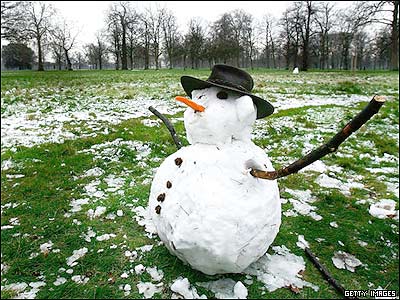 آدم برفی ای در هايد پارک لندن. با بارش برف و سرد شدن ناگهانی هوا در بريتانيا بالاخره زمستان با تاخير فراوان به اين جزيره می آيد. |