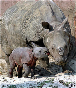 کرگدن مادر به همراه نوزادش در باغ وحشی در هند.