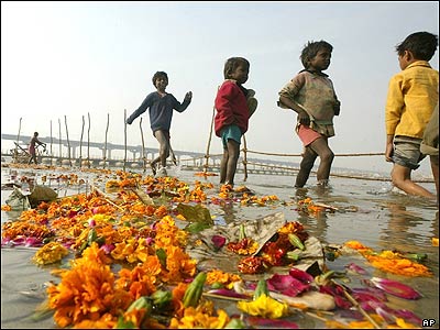 کودکان هندی برای يافتن سکه هايی که به عنوان نذری به درون رودخانه گنگ انداخته شده اند، آبهای آلوده اين رودخانه را در الله آباد هند جستجو می کنند.