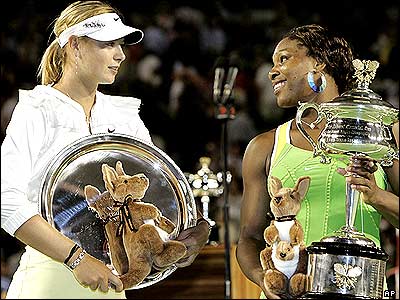 سره نا ويليامز و ماريا شاراپووا پس از مسابقه فينال بخش زنان، در مسابقات آزاد تينس استراليا. سره نا ويليامز تنيس باز آمريکايی با غلبه بر حريف روس خود، لقب قهرمانی اين مسابقات را بدست آورد.