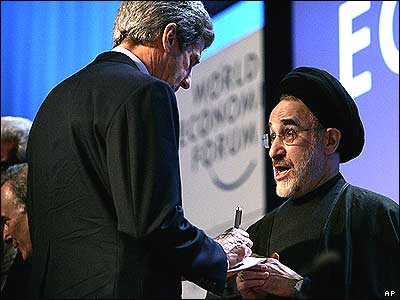 محمد خاتمی رئيس جمهور پيشين ايران، و جان کری سناتور ايالت ماساچوست آمريکا، در اجلاس مجمع جهانی اقتصاد در شهر داووس، شرق کشور سوئيس.