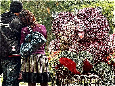 زوج تايوانی در نمايشگاهی از مجسمه های خوک ساخته شده از گل در تايپه. اين نمايشگاه در آستانه سال نو چينی برپا شده که امسال سال خوک است.