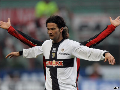 تصويری از ديدار آث ميلان و پارما از هفته بيست و يکم فوتبال سری آ ايتاليا. اين بازی را سرخ و سياه پوشان آث ميلان با تک گل اينزاگی بردند