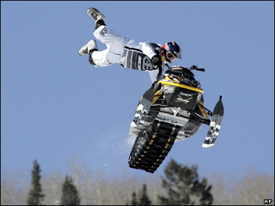 هيث فريزبی آمريکايی در حال اجرای حرکات نمايشی با اسنوموبيل در يازدهمين دوره از مسابقات زمستانی X که در پيست آسپن در ايالت کلرادو آمريکا برگزار شد.