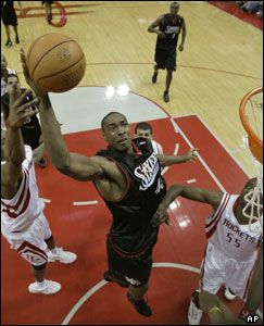 در مسابقات ليگ بسکتبال حرفه ای آمريکا، ان بی ای، هيوستون راکتز، فيلادلفيا سونتی سيکسرز را 105 به 84 شکست داد. استيون هانتر با شماره 45 از تيم سونتی سيکسرز، به سمت سبد حمله می کند.