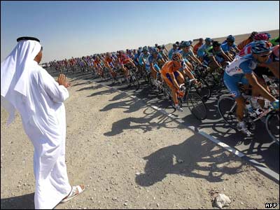 گذر دوچرخه سواران در قسمت دوم، از ششمين دوره رقابتهای دوچرخه سواری تور قطر در مسير الواکرا به دوحه.
