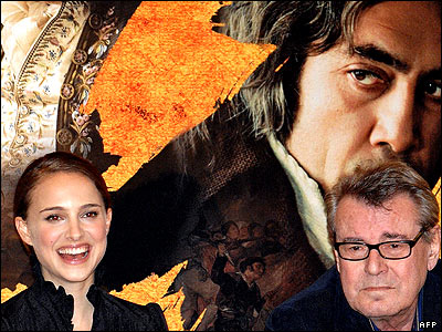 ناتالی پورتمن و ميلوش فورمن، کارگردان و بازيگر فيلم 'ارواح گويا' در يک کنفرانس خبری در پراگ، پايتخت چکسلاواکی.