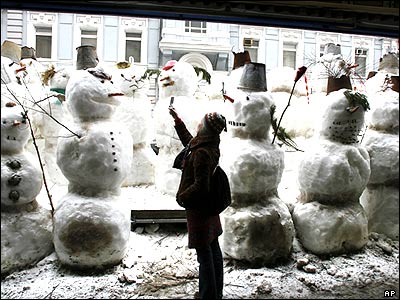 مجموعه ای از آدم برفی در مقابل ساختمان يکی از تئاتر های مسکو، پايتخت روسيه. اين آدم برفی ها برای تبليغ نمايشنامه ای به نام 'نمايش برفی' در اين محل قرار داده شده اند.