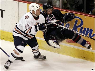 در سومين دور از مسابقات قهرمانی هاکی روی يخ NHL در ونکوور کانادا، ادمونتون اويلرز پنج بر سه از ونکوور کنوکس شکست خورد. در اين عکس رافی تورس با شماره 14 ماتياس اوهلاند را به گوشه زمين می برد.