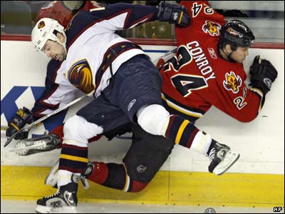 در رقابتهای قهرمانی هاکی روی یخ NHL، دو تیم آتلانتا ترشرز و کالیاری فلیمز در کالیاری کانادا مقابل هم قرار گرفتند. کالیاری چهار بر یک آتلانتا را شکست داد. |