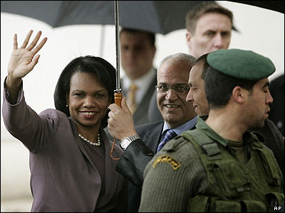 کاندوليزا رايس، وزير خارجه آمريکا در ادامه سفرش به خاورميانه با مقامات فلسطينی ديدار کرد. در اين تصوير صائب عريقات، مذاکره کننده ارشد فلسطينی، در کنار او ديده می شود. |