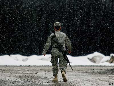 سربازی آمريکايی بر روی برفهای پايگاه اورگون در شرق افغانستان که يکی از بزرگترين پايگاه های آمريکا در شرق افغانستان است، قدم می زند.