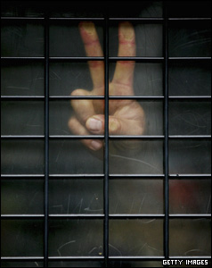 فردی که در جريان يک گردهمايی اعتراض آميز به ديدار ديک چنی، معاون رئيس جمهور آمريکا از سيدنی توسط پليس دستگير شده، دستش را به علامت پيروزی نشان می دهد.