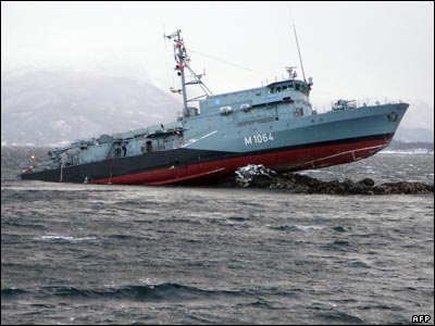 کشتی مين روب آلمانی با 42 سرنشين بدون آنکه آسيب ديده باشد، در نزديکی غرب نروژ به گل نشسته است. |