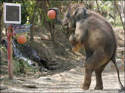 يک فيل در حال پرتاب توپ بسکتبال در شمال تايلند. سال گذشته اعلام شد که تايلند حدود 4000 فيل دارد، 2500 فيل اهلی و 1500 فيل وحشی. اين کشور در سال 1950، دارای 50 هزار فيل بود.