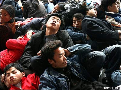 مسافرين چينی در يک اتاق انتظار قطار بعد از بازگشت از تعطيلات سال نو چينی