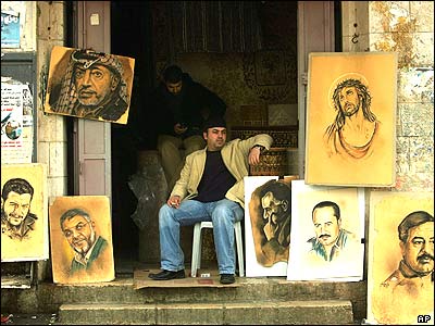 نقاش فلسطينی در مغازه اش. در در گيری های تازه در شهر غزه ميان طرفداران فتح و حماس 4 نفر کشته و حدود بيست نفر نيز مجروح شده اند.