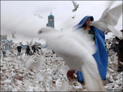 یک زن افغان از قوم ازبک در مقابل زیارتگاه منسوب به حضرت علی در مزار شریف، افغانستان. |