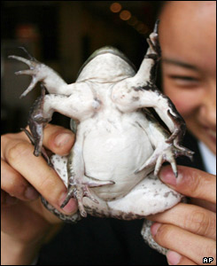 پیشخدمت رستورانی در چین قورباغه ای با هشت پا را به خبرنگاران نشان می دهد. صاحب این رستوران که معمولا پای قورباغه را به عنوان غذا عرضه می کند، از خیر کشتن این جانور استثنایی گذشته است.