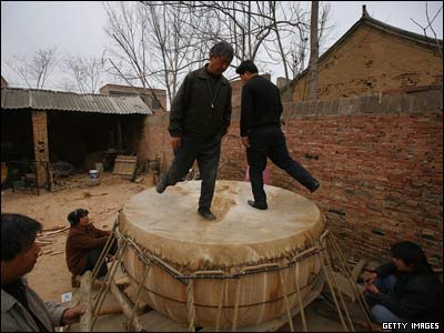 اهالی دهکده ای در چین برای ضعیف کردن قدرت ارتجاع این طبل بزرگ بر روی چرم آن راه می روند.