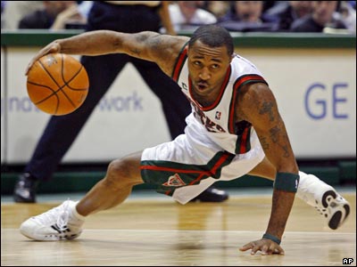مو ویلیامز از میلواکی در حال کنترل توپ، در مسابقات ليگ بسکتبال حرفه ای آمريکا، ان بی ای، که در میلواکی برگزار شد، میلواکی، گولدن استیت واریورز را 122 بر101 شکست داد.
