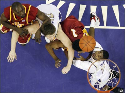 در ادامه مسابقات بسکتبال دانشگاهی آمریکا (NCAA)، در دیدار کالیفورنیای جنوبی و واشنگتن، بازیکنان دو تیم برای تصاحب توپ تلاش می کنند. مسابقه با نتیجه 85 بر 70 به سود واشنگتن به پایان رسید. |