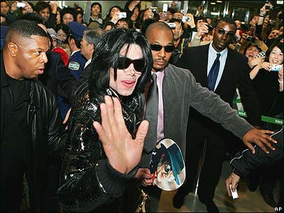 مایکل جکسون، خواننده مشهور، در فرودگاهی در ژاپن. این دومین باری است که او برای دیدار با هواداران خود به این کشور سفر کرده است. هواداران مایکل جکسون مبلغی برابر با 3500 دلار پرداخته اند تا کمتر از یک دقیقه در کنار او حضور داشته باشند