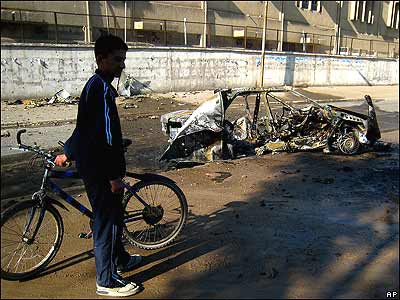 مرد عراقی در کنار خودرویی منفجر شده در مرکز شهر بغداد. انفجار این خودرو در منطقه کراده بغداد دو کشته و چندین زخمی در بر داشته است