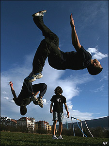 تعدادی جوان بلغار در حال تمرین حرکات "یاماکاسی" که نوعی ورزش تفریحی است که شامل بالارفتن و پریدن از روی دیوار می شود |