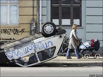 خودرویی واژگون شده در کپنهاک دانمارک. تخیله ساکنان غیر قانونی یک محل اسکان جوانان باعث نا آرامیهای خیابانی در یکی از محلات این شهر شد