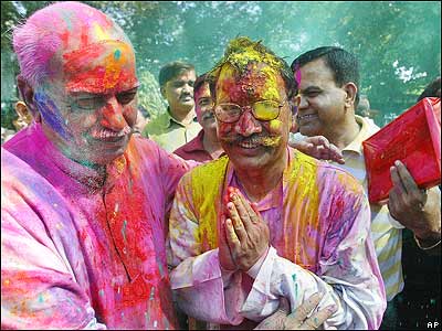 ال.کی. ادوانی، از اعضای ارشد حزب مخالف دولت هند (بی جی پی) و بی.سی.خندوری، سر وزیر ایلات شمالی اوتراکند، در حال تماشای مراسم جشن هولی (جشن رنگها) متعلق به آیین هندوها که به بهانه فرارسیدن بهار در دهلی نو برگزار شد