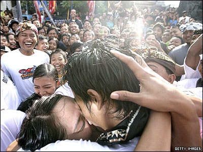 زوجی اهل جزيره بالی در جریان "جشنواره بوسه" که يک روز پيش از جشن سال نوی هندوها يا " روز سکوت" در اندونزی برگزار می شود، هميديگر را می بوسند.